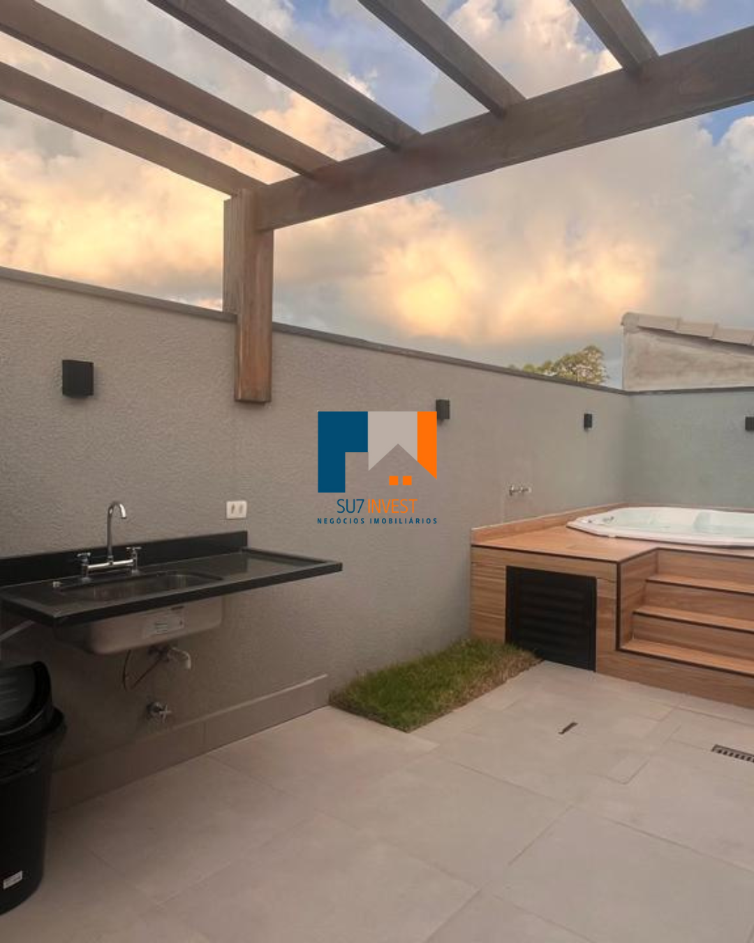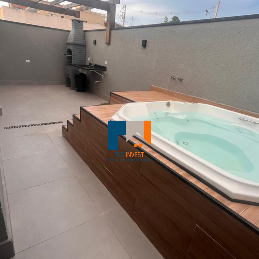 Área Gourmet com pergolado, churrasqueira, pia de serviço e jacuzzi.